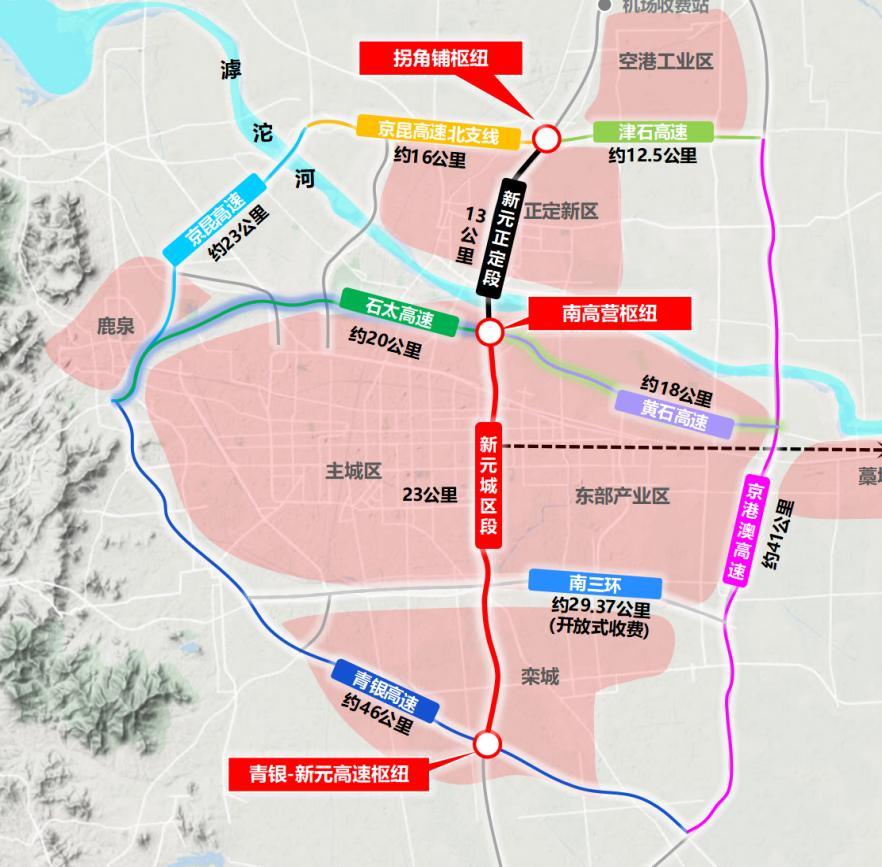 新元正定段北起石家庄北收费站,南至南高营立交,路线车道,全线处。市政化改造后对主路两侧进行拼宽,改造为城市快速路,设计速度每小时100km。