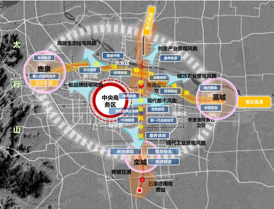 新元作为都市发展新中枢,缝合城市横向发展组团,重构各区产业布局,使得各区多元化、差异化协同发展,助力石家庄高品质发展。建议打造北段文化旅游、中段商业品质、南段装备制造区。布局低密度新型商业、现代商贸、工业设计、文化旅游、体育休闲、医疗康养、航空制造、智慧物流等业态。