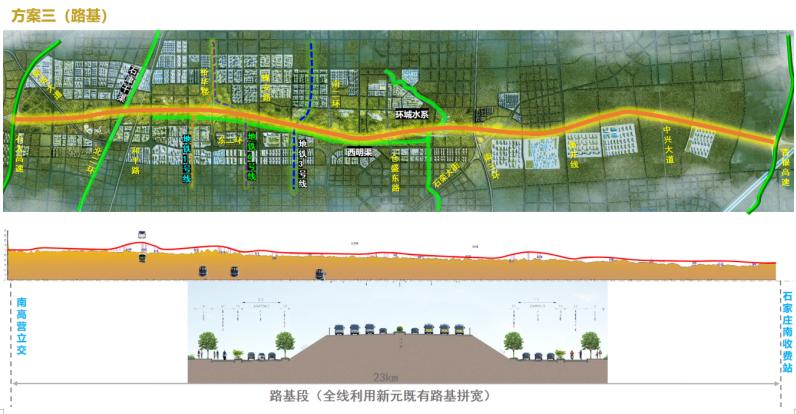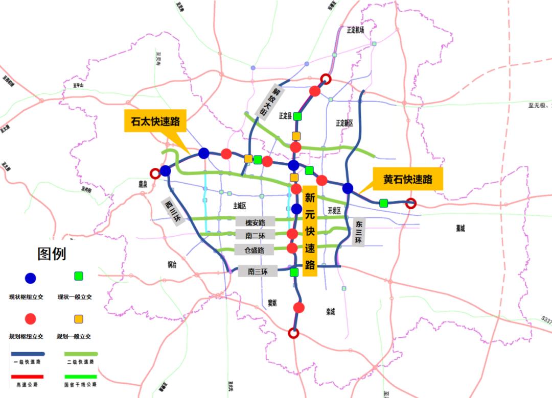 在市政化改造方面,构建拉大城市骨架、支撑组团发展的“田字形”快速系统,有效连接二环路并闭合三环路系统。同时合理布局、增设立交节点。新元城区段全线处互通立交,其中利用并改造既有互通立交2处,新建4处枢纽互通立交,1处一般立交。新元正定段全线处互通立交,其中利用并改造既有互通立交1处,新建2处枢纽互通立交,1处一般立交。石太黄石段全线处互通(含南高营),其中利用并改造既有互通立交7处,新建3处枢纽互通,1处一般立交。实现快速路网的高效转换。完善辅道系统,补全城市交通功能,以快线与慢网构建立体多模式复合交通走廊。具体交通设计方案,详见附件二。
